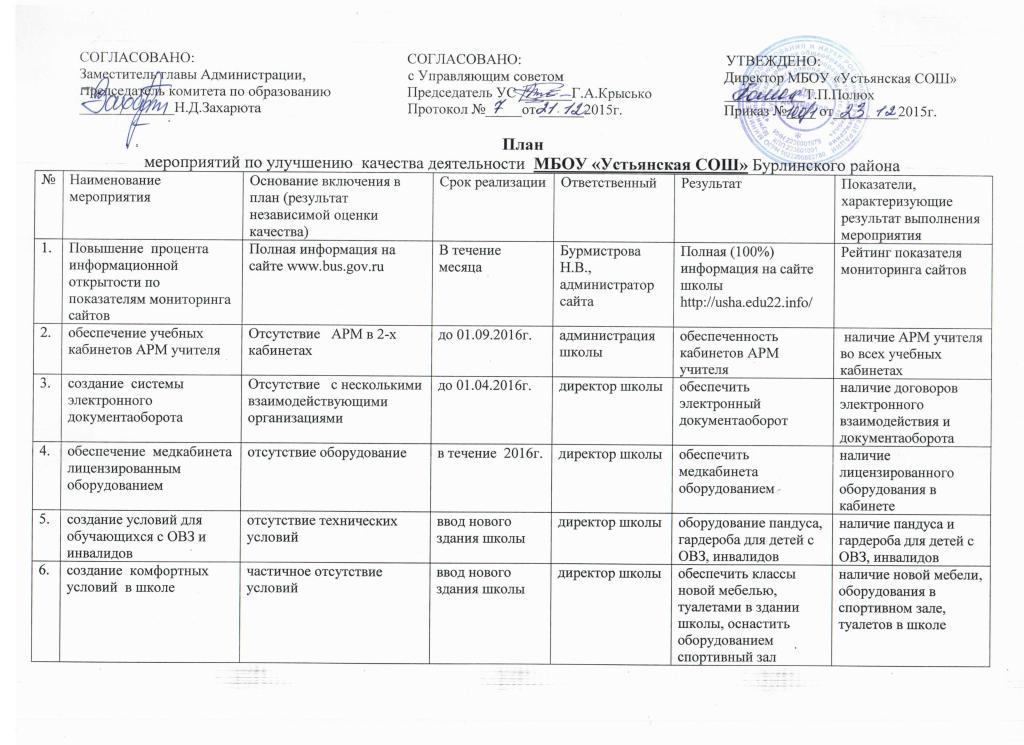 План мероприятий МБОУ “Устьянская СОШ”
