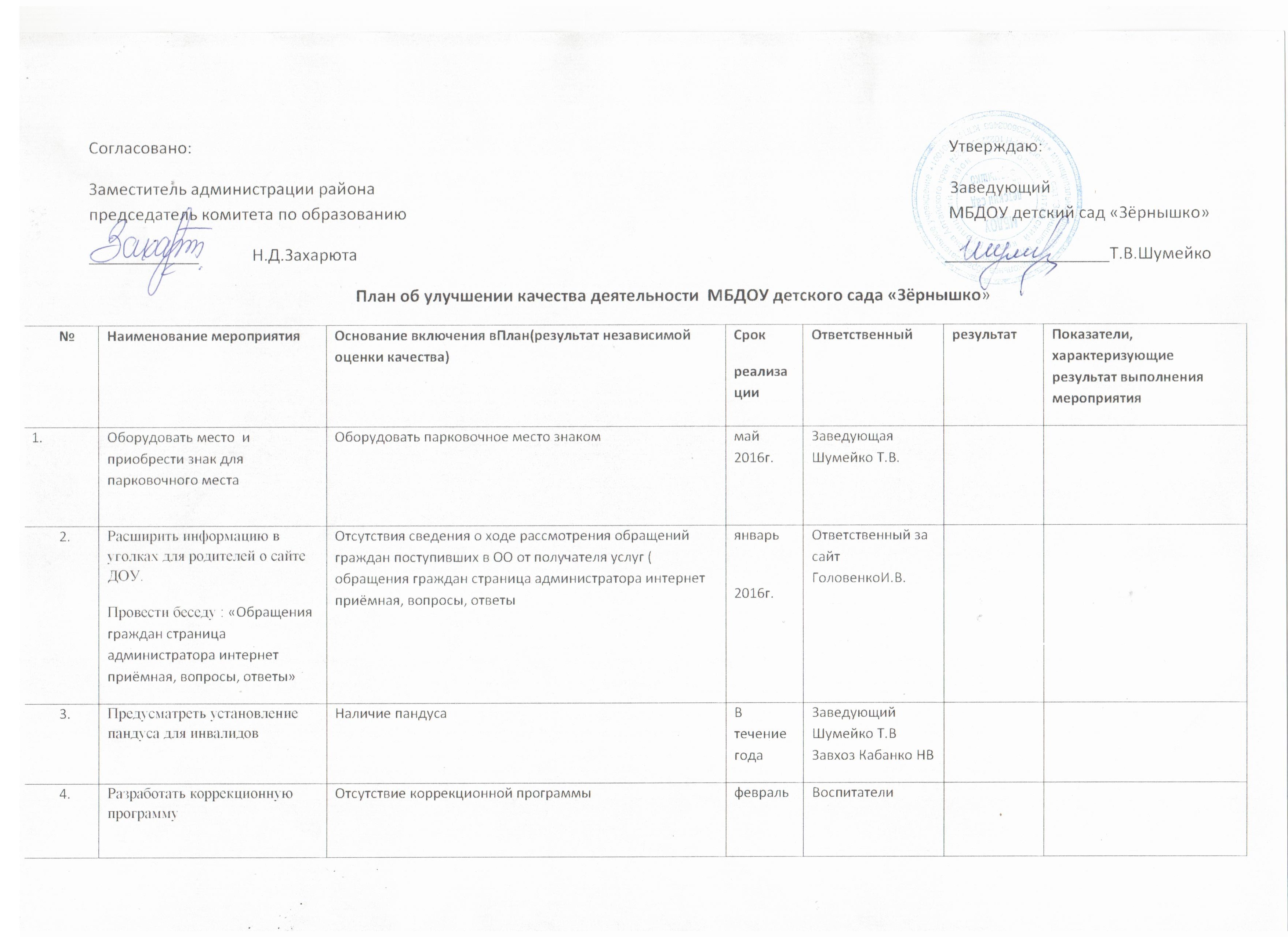 План мероприятий МБДОУ “Зернышко”