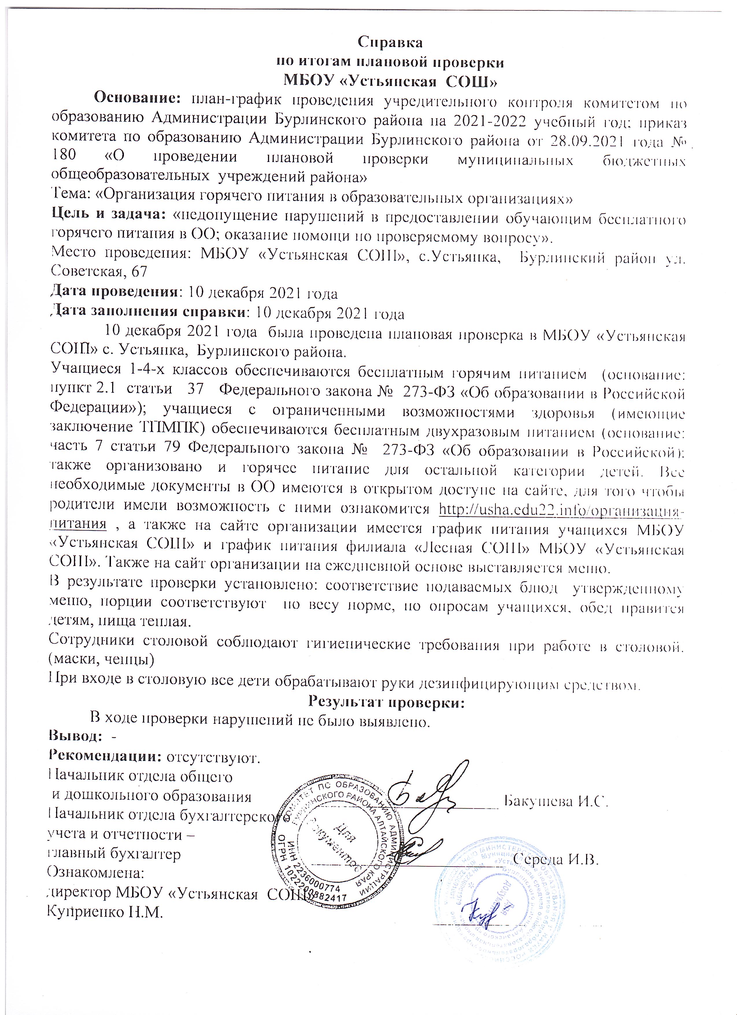 Справка по итогам плановой проверки МБОУ “Бурлинская СОШ”