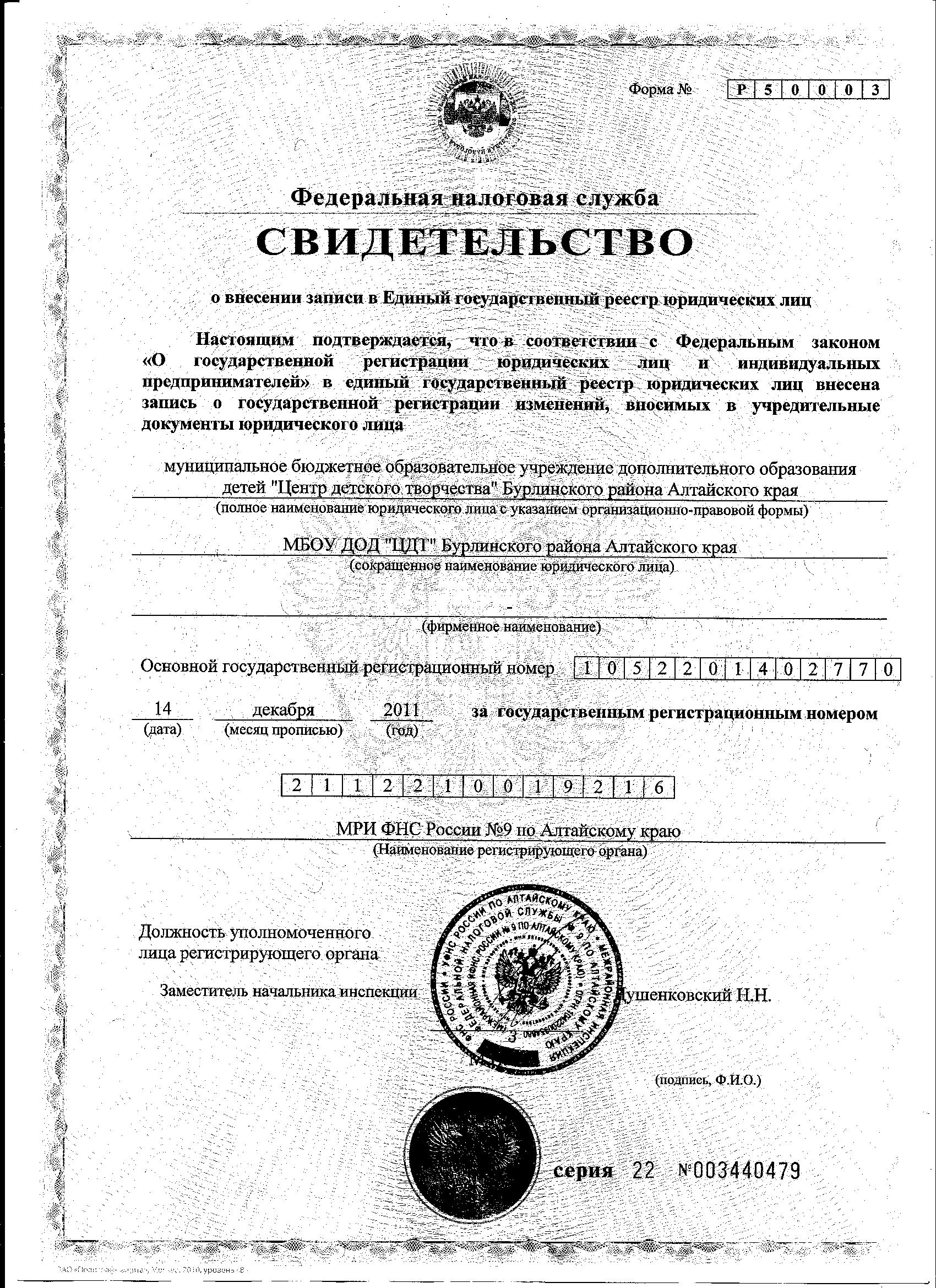 Свидетельство о внесении записи в Единый государственный реестр юридических лиц